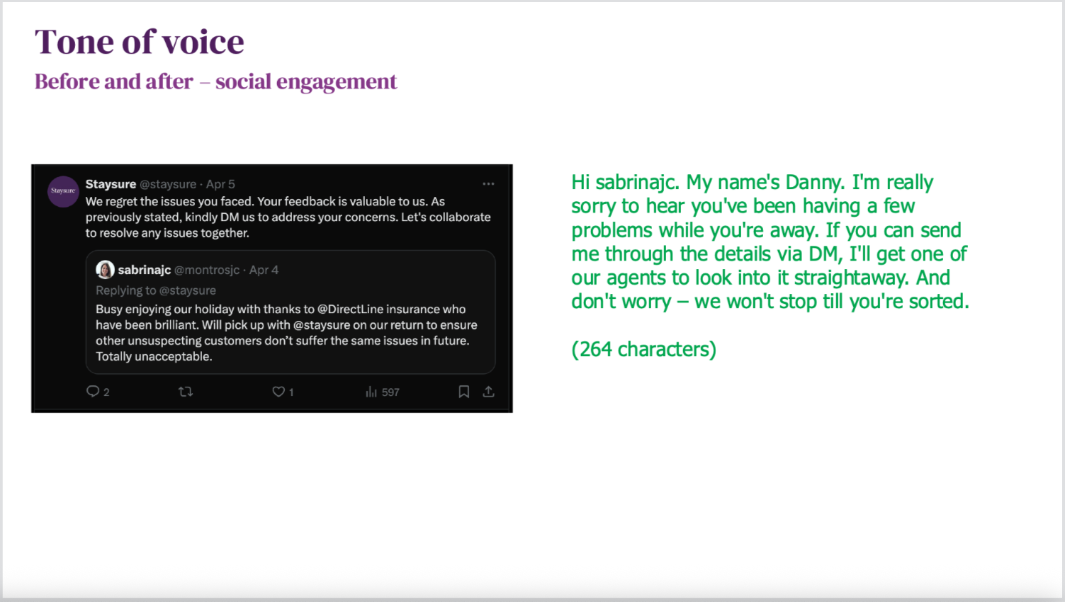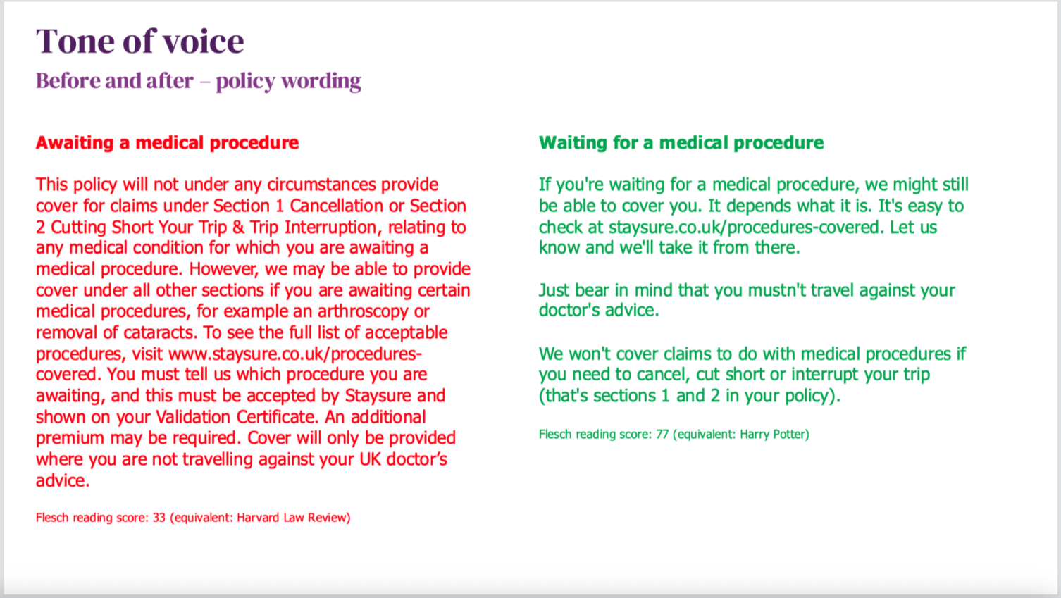 Everything gets the treatment – from social posts (which are pretty straightforward) to insurance policy wording. This is trickier, due to FCA and compliance regulations, but it’s still necessary to make sure a brand sounds consistent across the board.