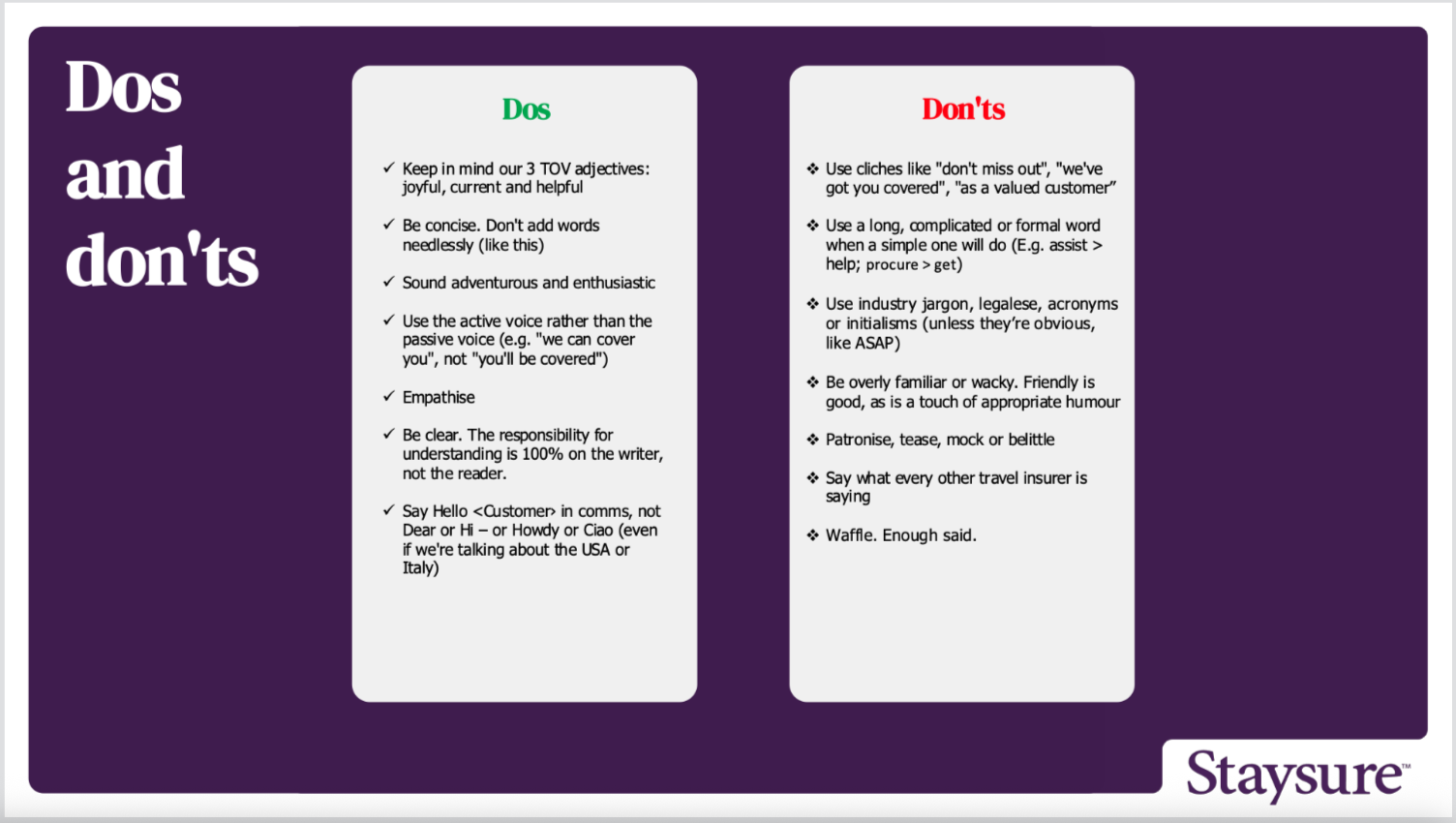 Every time I write TOV guidelines, I like to include a 1-page crib sheet giving dos and don’ts. Clients and employers find this very useful – because let’s face it, not every employee will constantly refer back to full TOV guidelines after the first read. It helps it land and stay front of mind.