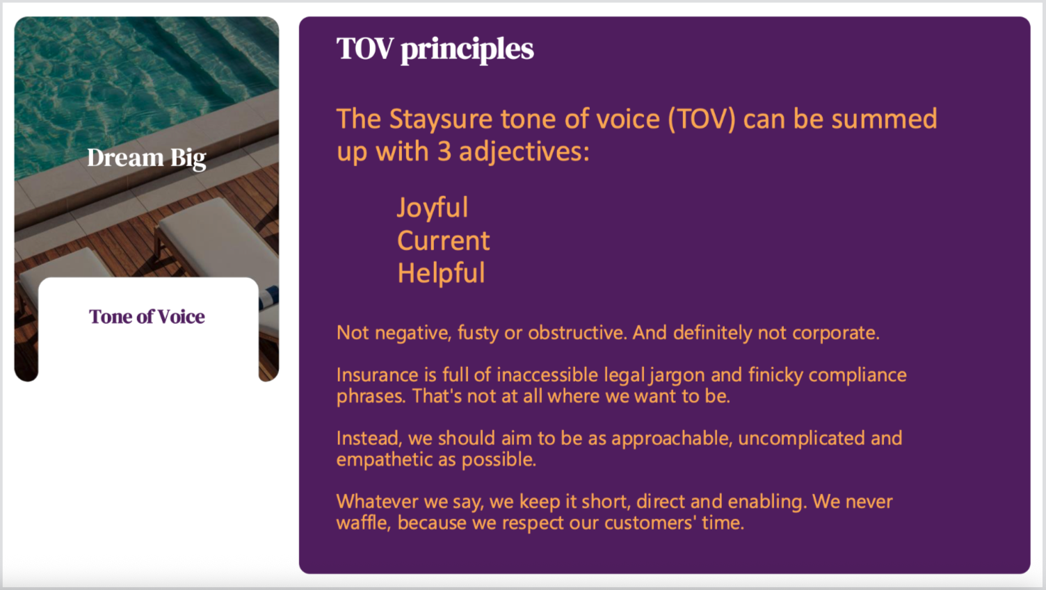 We summarised the voice in 3 words: joyful, current and helpful. The framework unpacked what that meant in practice.