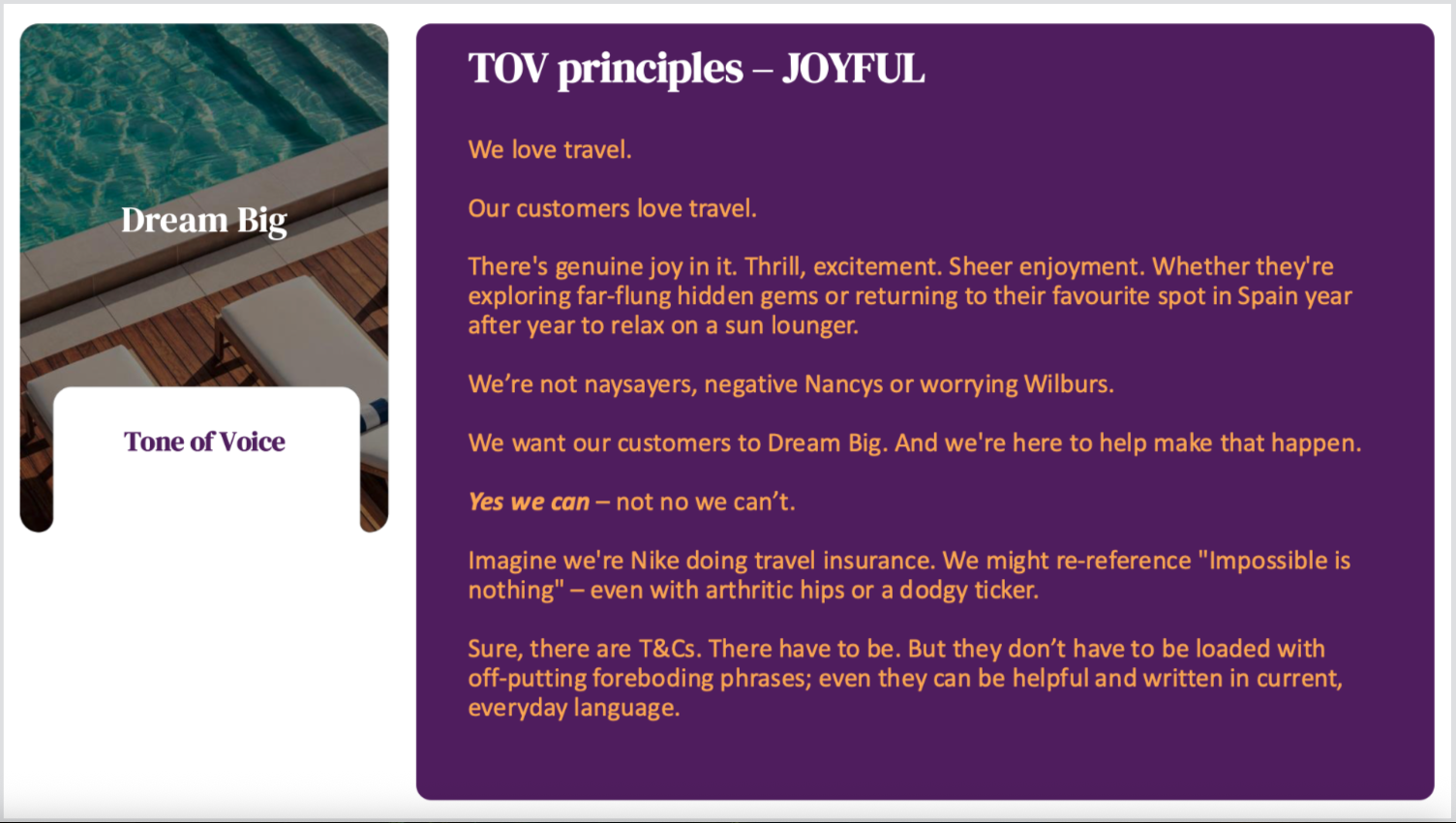 A rebrand and TOV shift only works if that voice holds everywhere. I built this framework to make sure “Dream Big” translated consistently across every touchpoint – from press ads and CRM to social engagement and policy wording.
